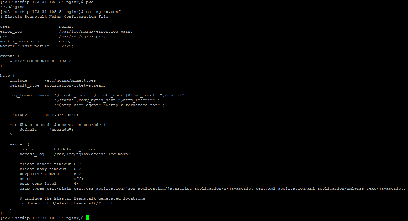 /etc/nginx/conf.d/elasticbeanstalk에 있는 모든 .conf파일을 include 하게 되어있는 걸 확인할 수 있습니다.