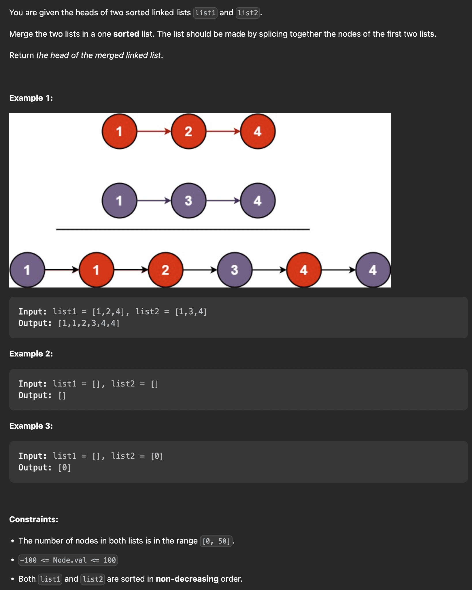 public ListNode mergeTwoLists(ListNode list1, ListNode list2) {